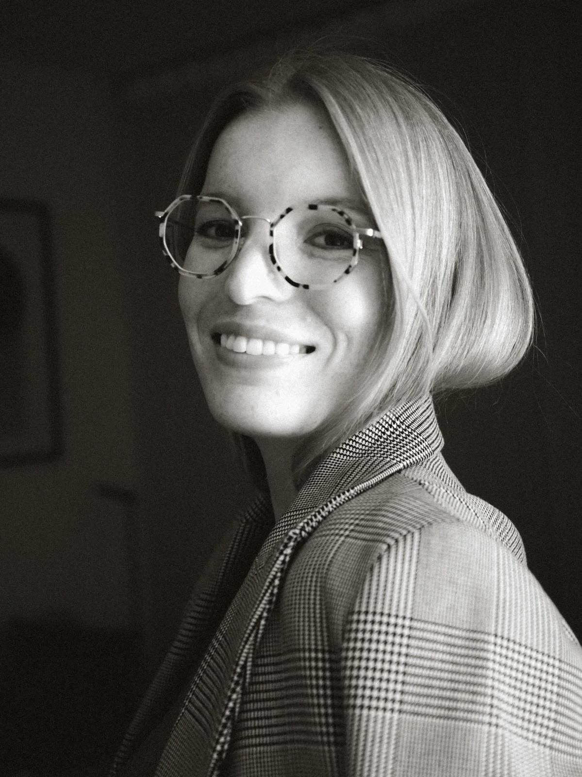 Schwarz-weiß-Fotografie einer lächelnden Frau mit Brille und glattem, schulterlangem Haar, trägt ein kariertes Jackett.