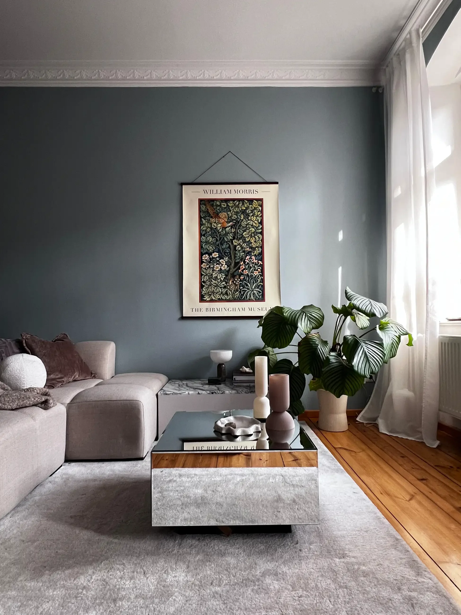 Modernes Altbau-Wohnzimmer,  mit grau-blauer  Wand, greiges Sofa, verspiegeltem Couchtisch mit Dekoration, großen Zimmerpflanzen und floralem Wandbild.