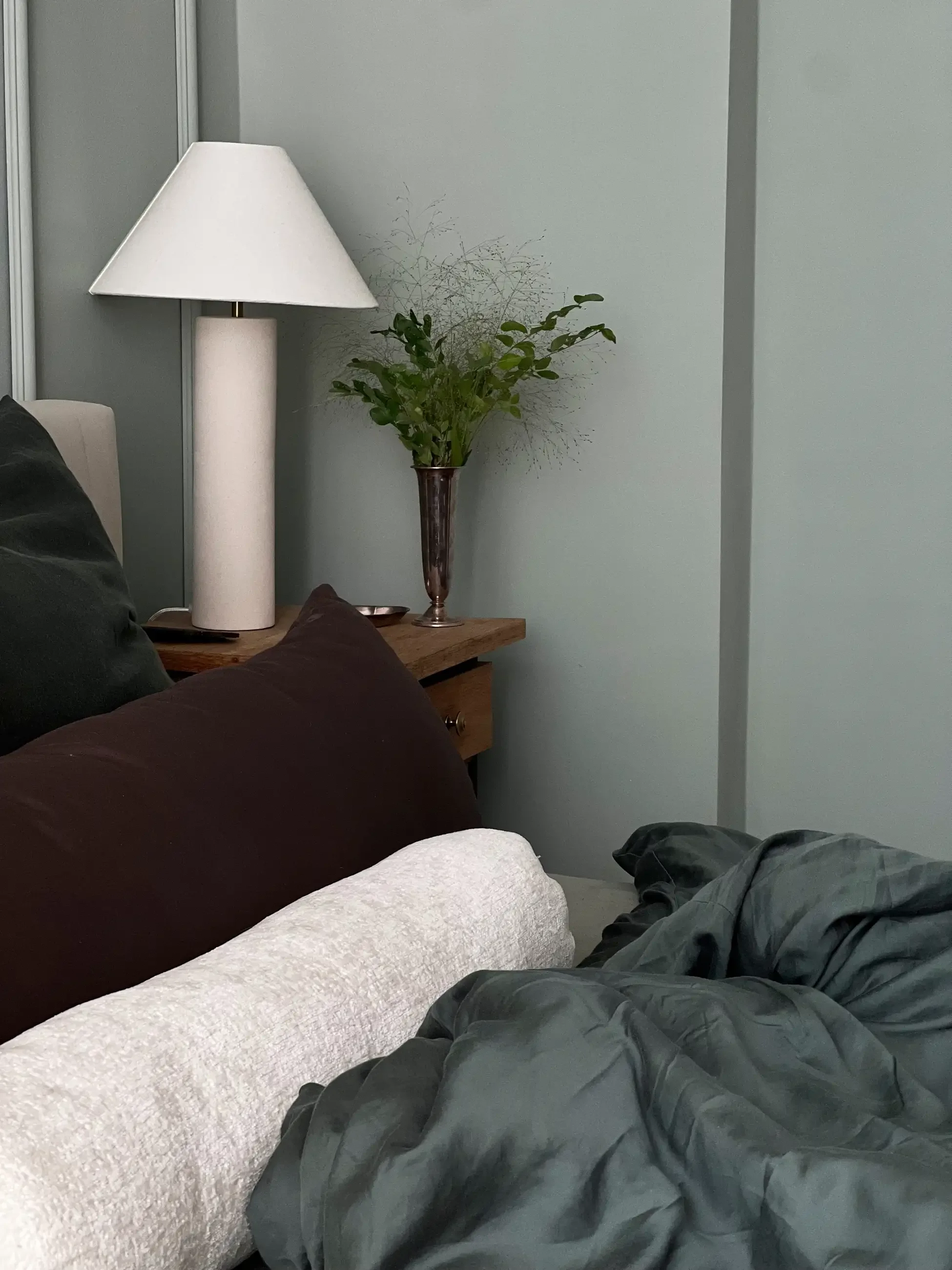Bett mit gepolstertem Kopfteil vor grau-grüner Wand mit Stuck und großem Bild. Auf dem Bett dekorative Kissen in Blau, Grün und Braun. Daneben antiker Nachttisch mit weißer Tischleuchte.
