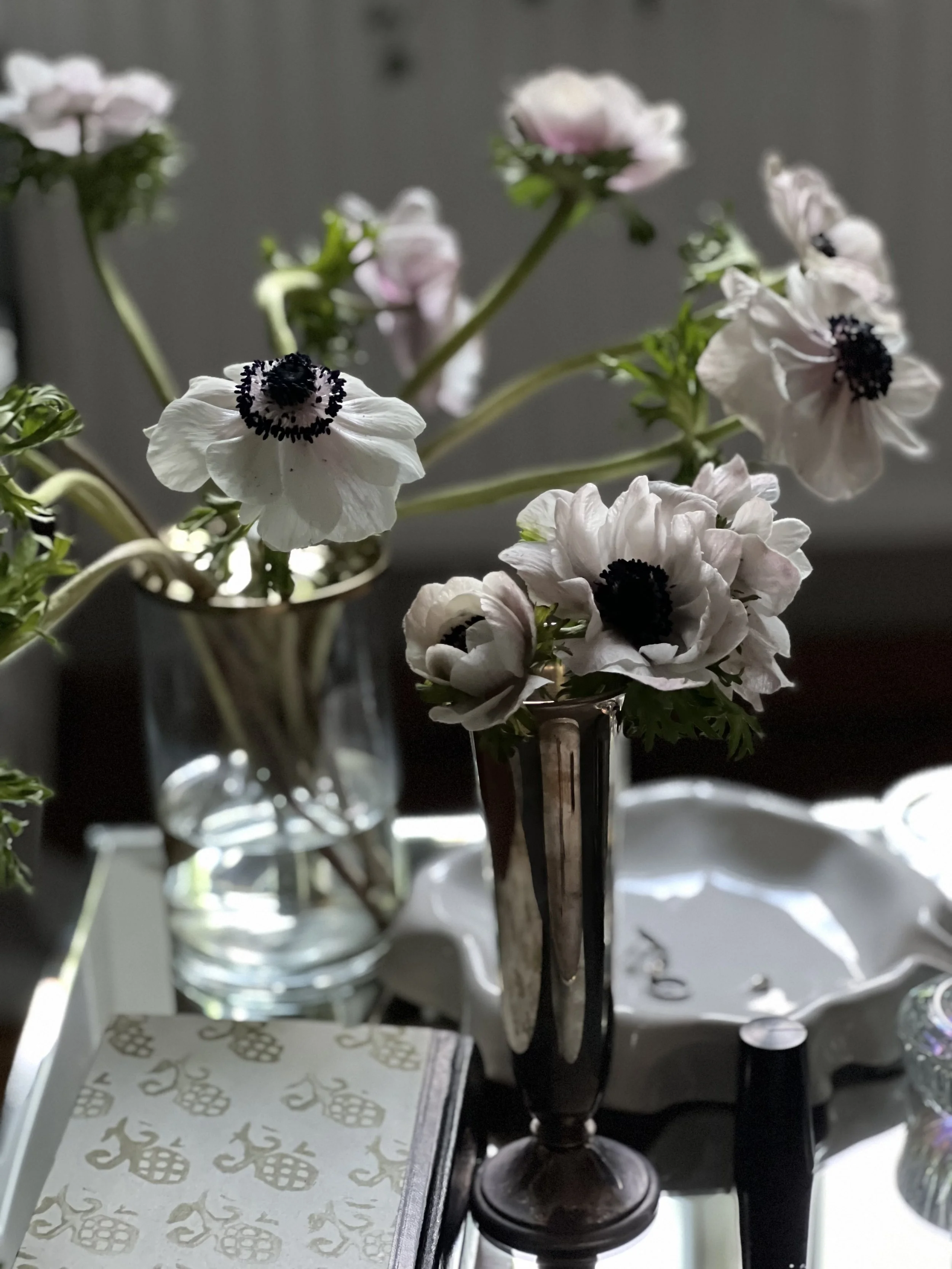 Tischdekoration mit Blumen in antiker Vase, Bücher, dekorative Schale.