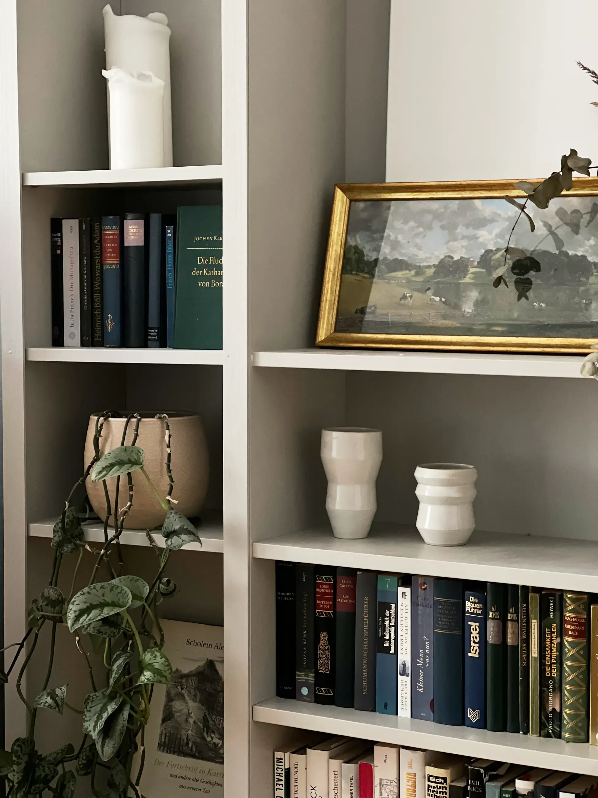 Styling Bücherregal mit Büchern,  weiße Vasen, Topfpflanzen und gerahmtem Landschaftsbild.